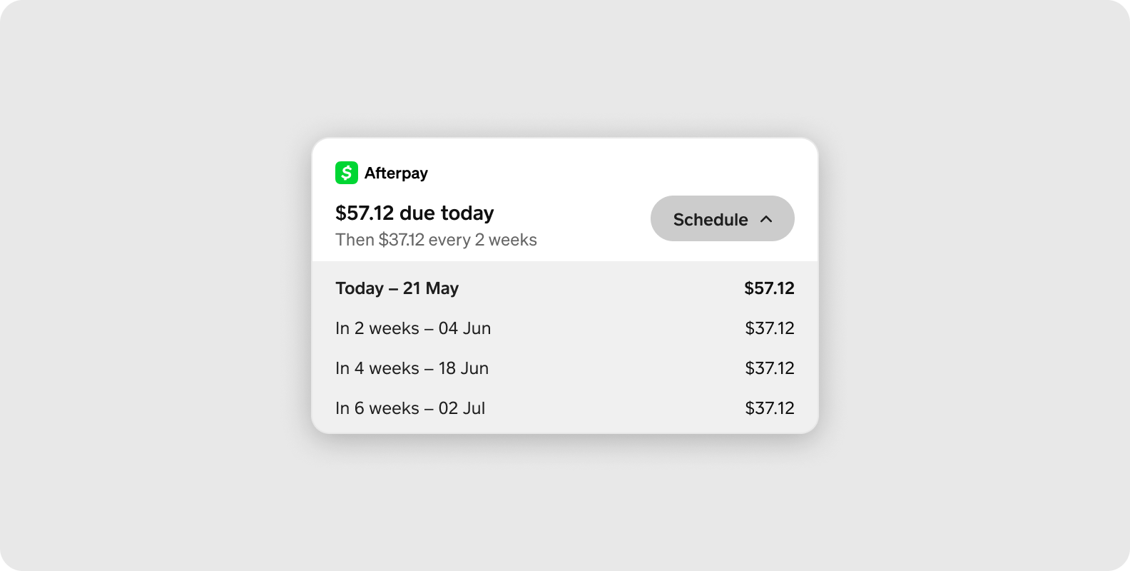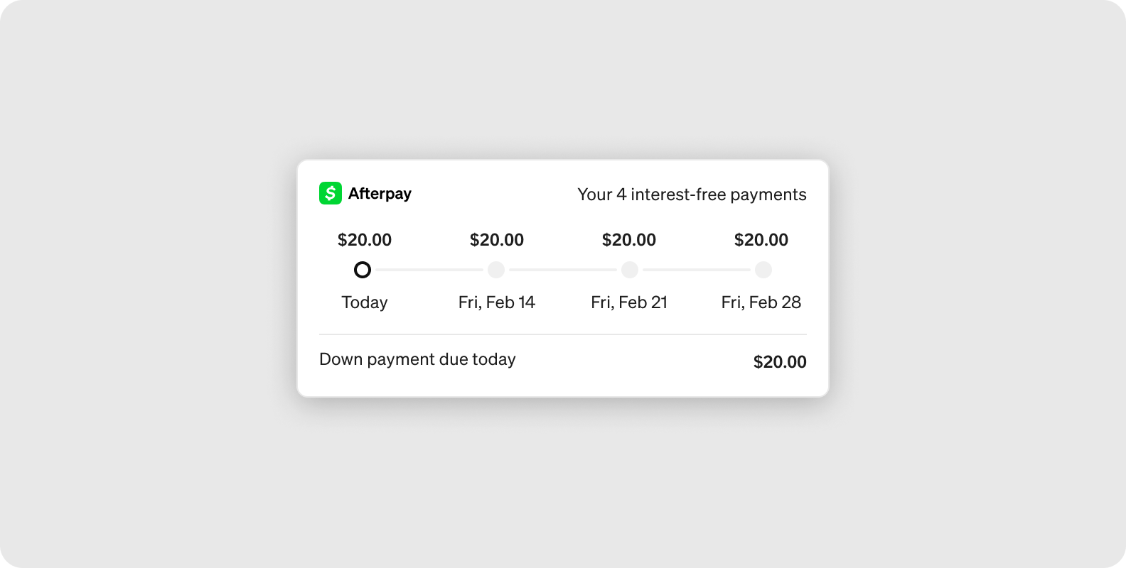 Use the unconnected widget on your checkout page before the customer starts the Cash App Afterpay checkout flow. This version of the widget displays an estimated payment schedule based on the initial order amount; this is only an approximation based on the initial order total.