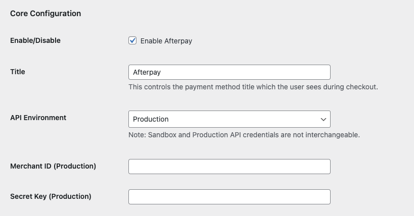 Enter the Secret Key provided by Cash App Afterpay into the Secret Key field.