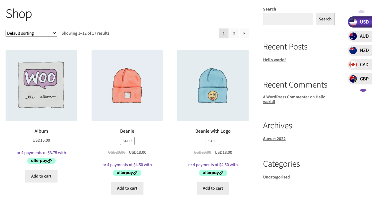 In the screenshot above, the store is based in the USA and the customer wants to pay with US dollars. The prices for the items are in US dollars.