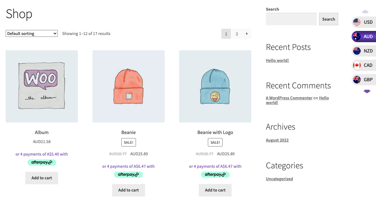 In the screenshot above, the customer wants to pay in Australian dollars. The customer clicks the AUD button on the right side of the page. The prices automatically change from US dollars to Australian dollars.