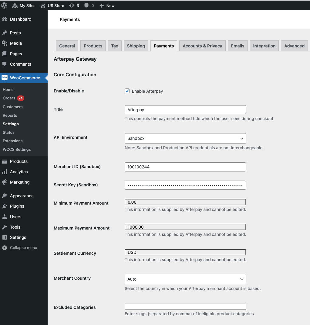 Click Settings, and then click the Payments tab. The Cash App Afterpay Gateway information appears.