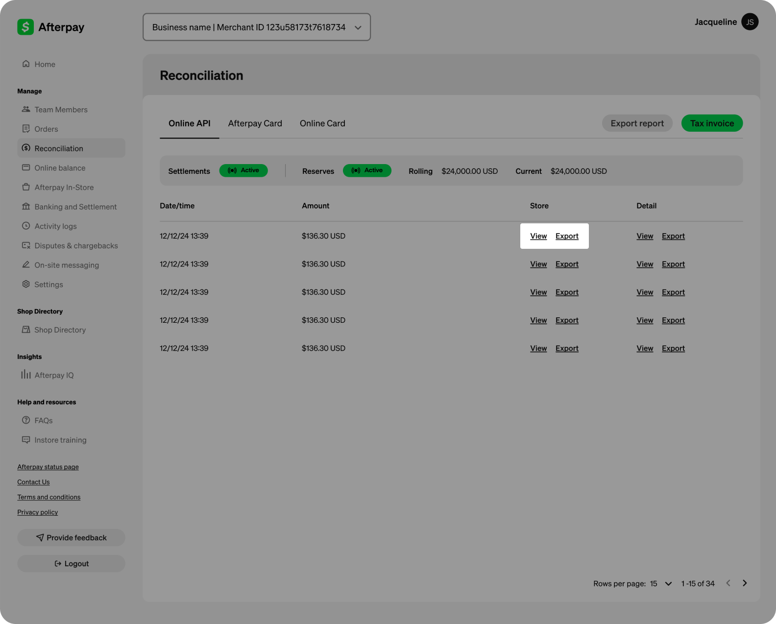 You can view and export your settlement files in the reconciliation tab of the Business Hub.