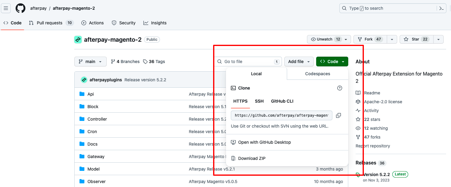You can find a table of the Afterpay Plugins for Adobe Commerce/Magento 2 here. It also contains useful information on the manual installation process.