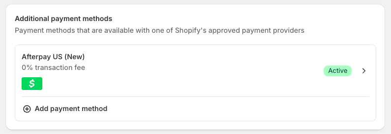 Return to your list of additional payment methods. Make sure that Afterpay US (New) is listed as an active payment method; Afterpay (New) shouldn’t be on the list.