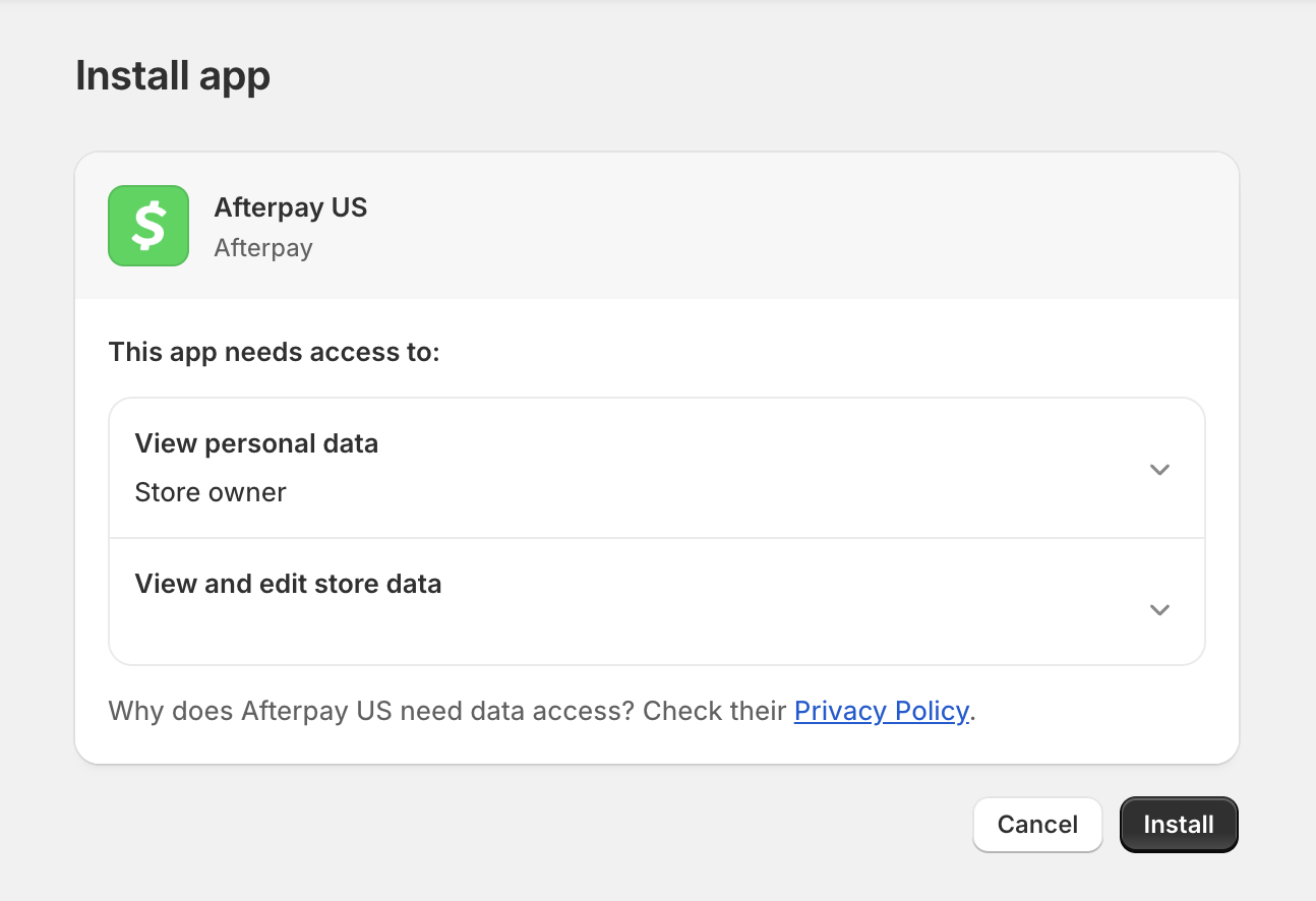 To avoid issues installing the new Afterpay US payment app, check that you have Shopify installed and working.