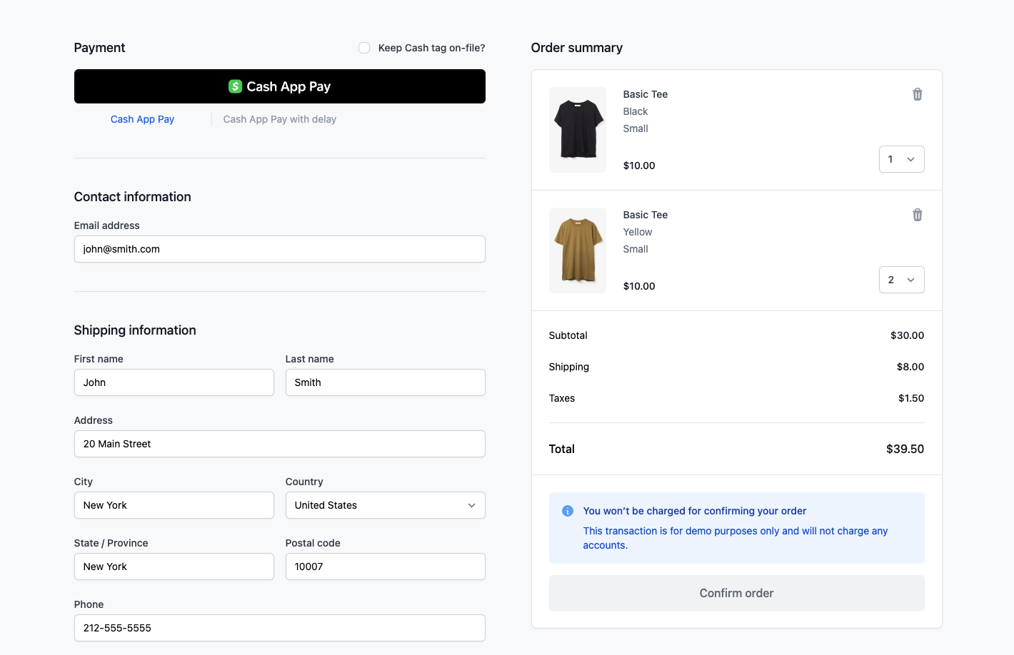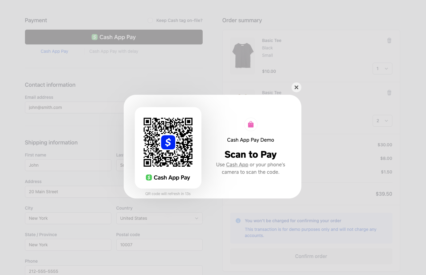 Cash App brand adherence: Pay Kit ensures that you adhere to Cash App Pay’s brand guidelines and requirements. Any branding and UI updates are automatic and do not need any intervention from your engineering teams.