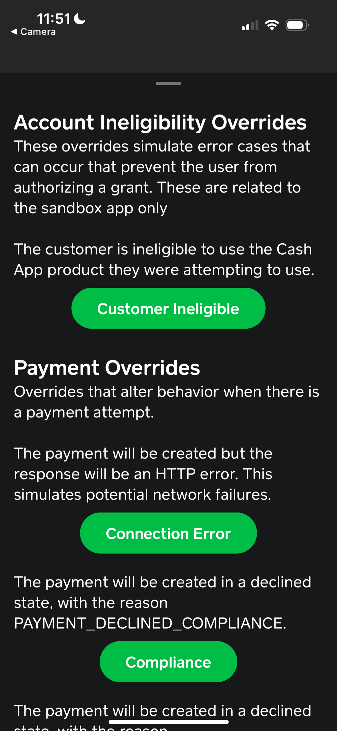 Therefore, the Sandbox App is very useful to Partners because they don’t have to download and set up Cash App with a Production (i.e., real bank) account. We provide them an experience that is almost identical to what actual users might see inside of Cash App when they use Cash App Pay for payments.