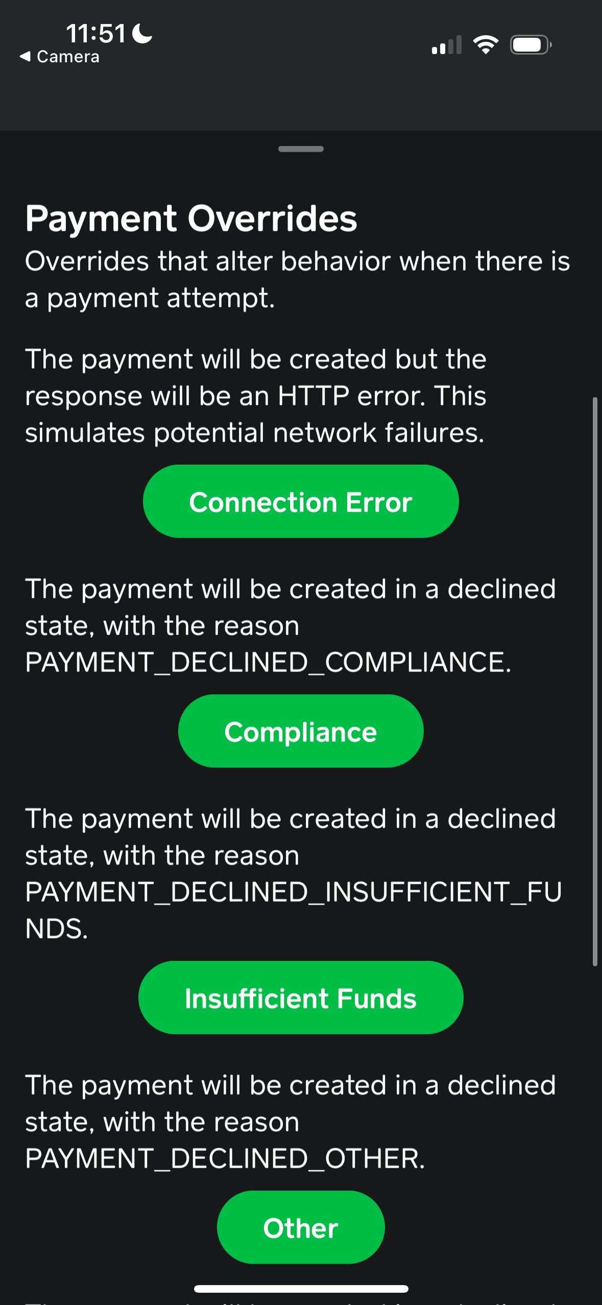 4 Scroll down for more test options. In the picture below there are two more Payment Overrides Insufficient Funds and Other.